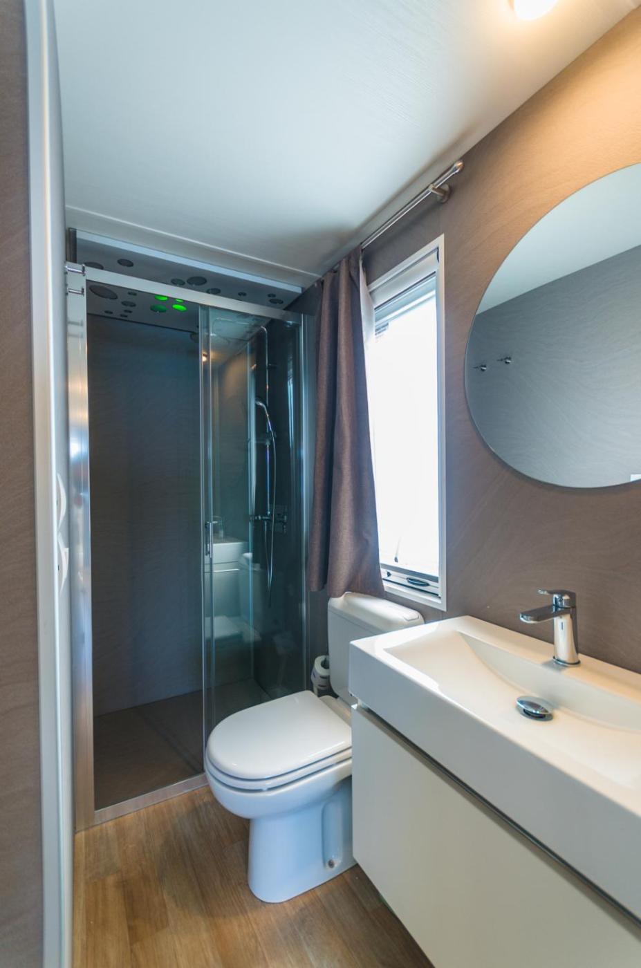 Mobile Home. Boasting a private entrance, this air-conditioned mobile home comes with 1 living room, 2 separate bedrooms and 1 bathroom with a shower. The mobile home features a seating area, a wardrobe and heating. The unit has 2 beds.