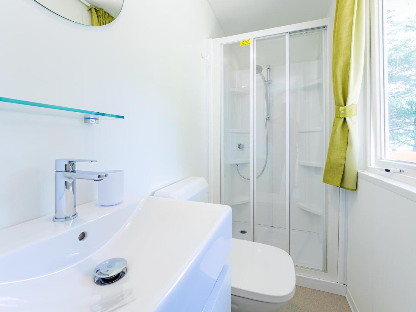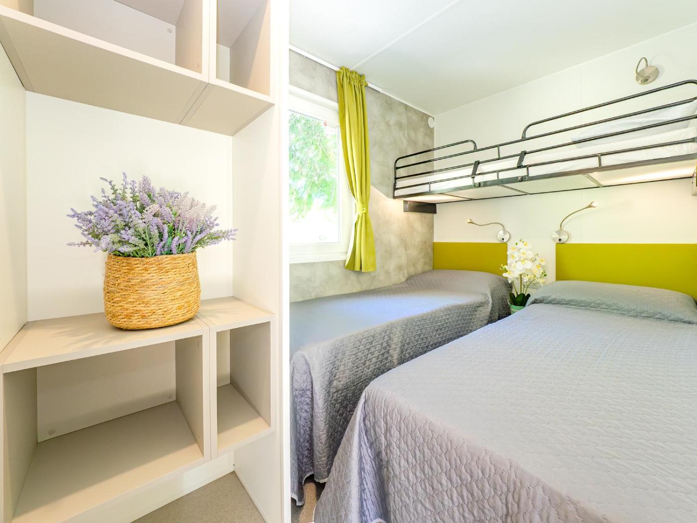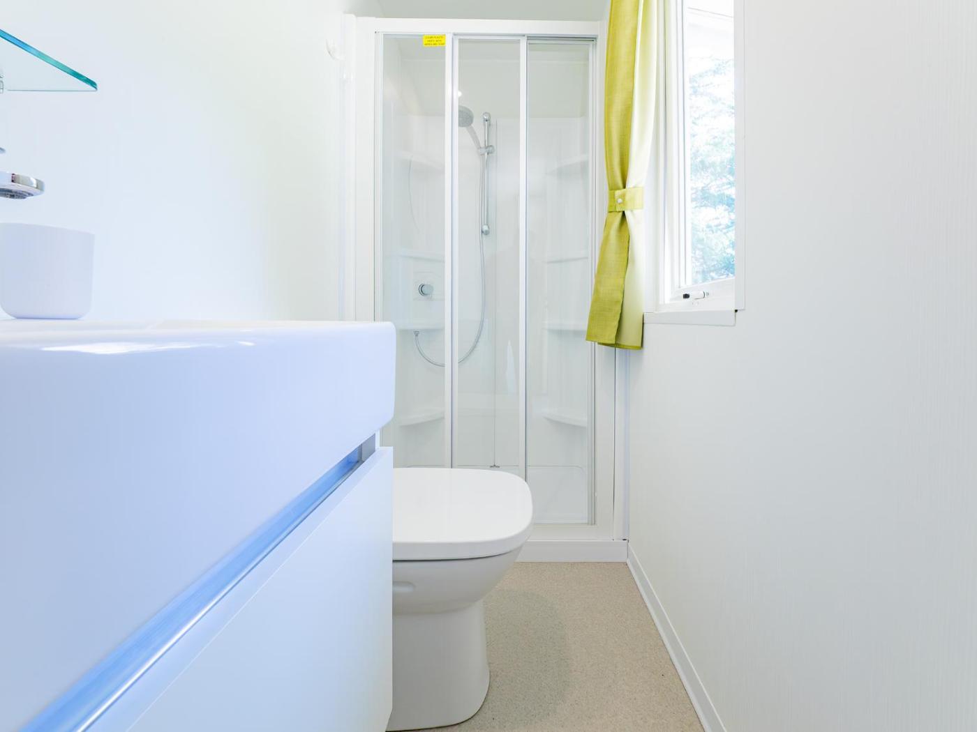 Mobile Home. This mobile home features 1 living room, 1 separate bedroom and 1 bathroom with a shower and free toiletries. The fully equipped kitchen has a stovetop, a refrigerator and kitchenware. Boasting a terrace with lake views, this mobile home also features a private entrance and a flat-screen TV. The unit has 4 beds.
